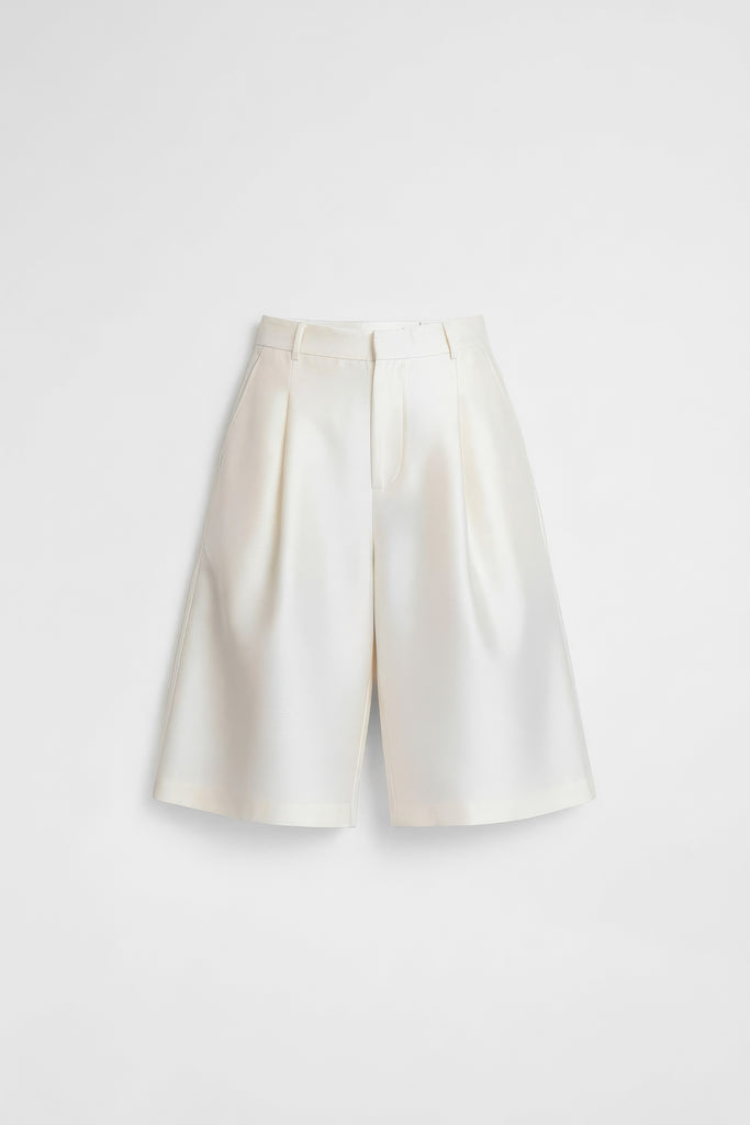 This high-waisted Bermuda short is crafted from a premium silk-wool blend, combining softness with structure. Designed with pleats for shape, side pockets, a zipper closure, and belt loops, it offers a slightly flared fit at the hem for effortless style and comfort.