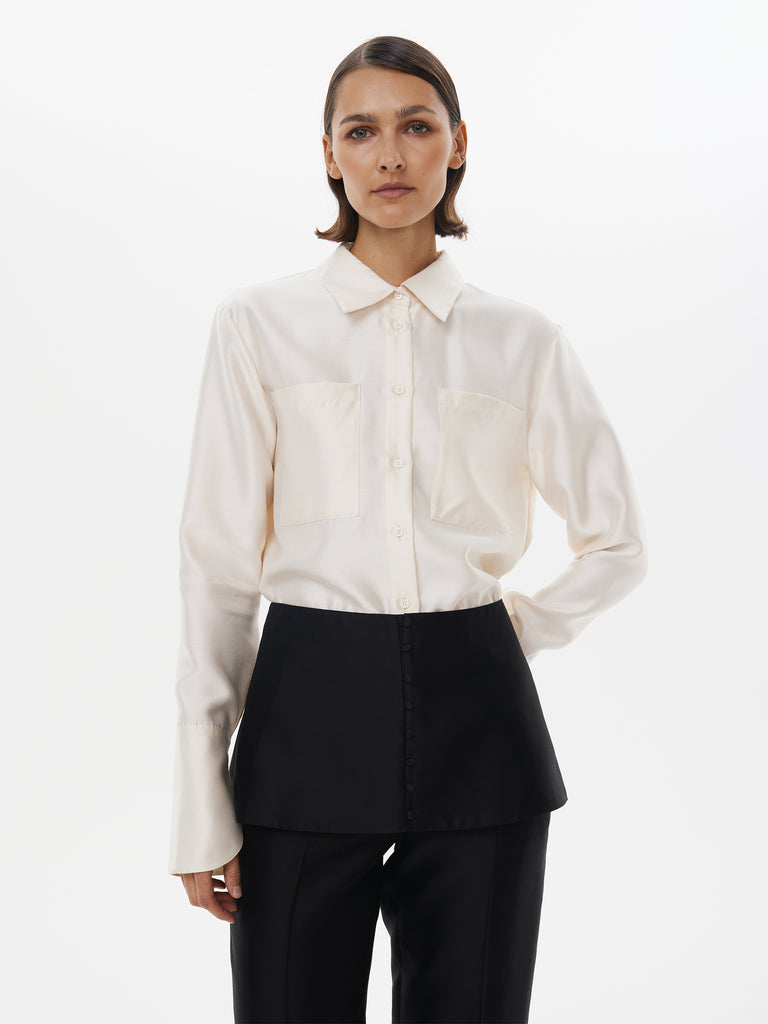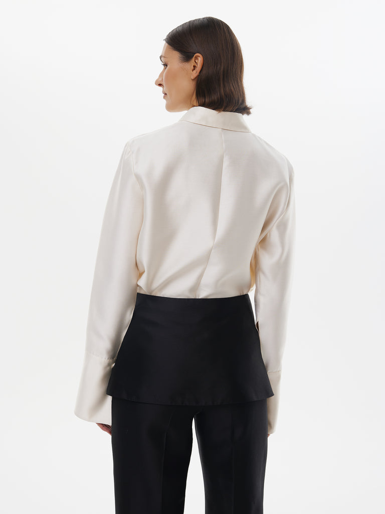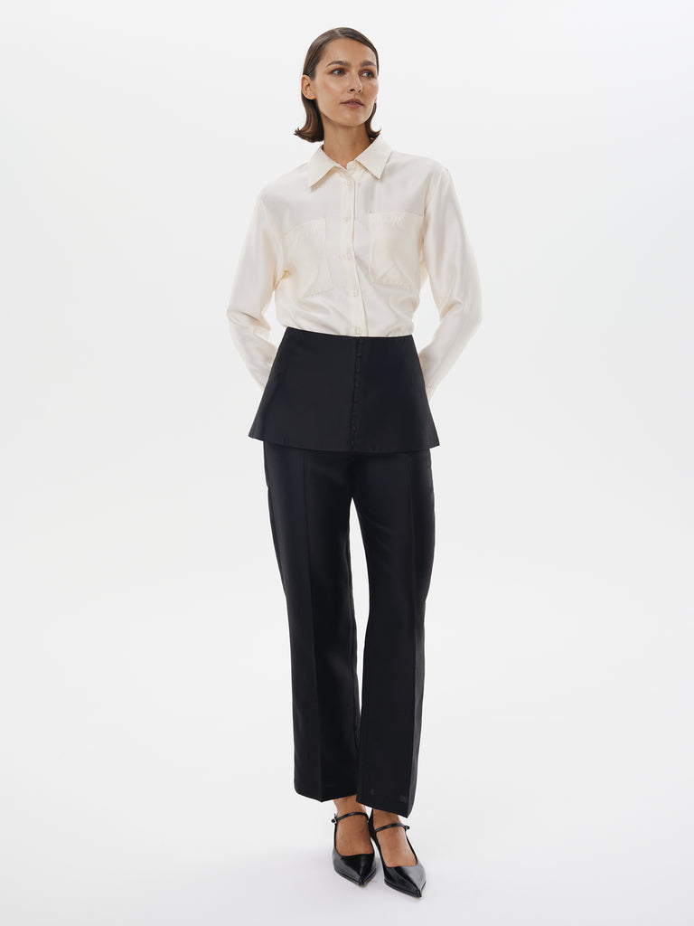 Crafted from a premium silk-wool blend, this belt skirt fastens with a row of fabric-covered buttons and is designed to layer over pants, dresses, or another skirt, creating an elevated, architectural silhouette. Comes in two colorways.
