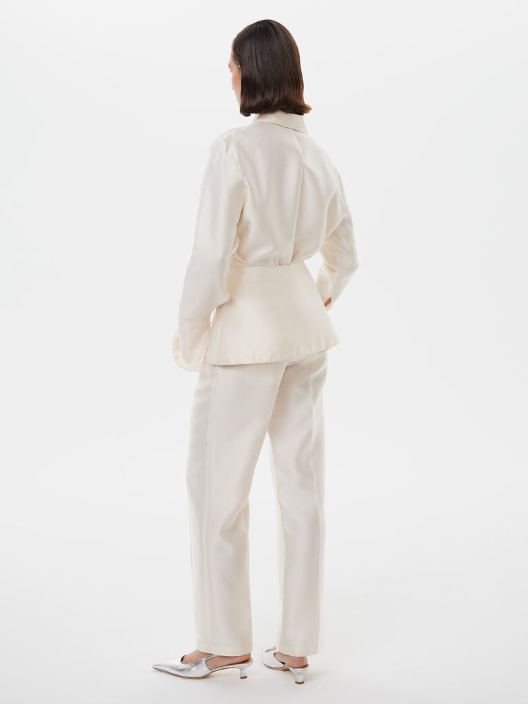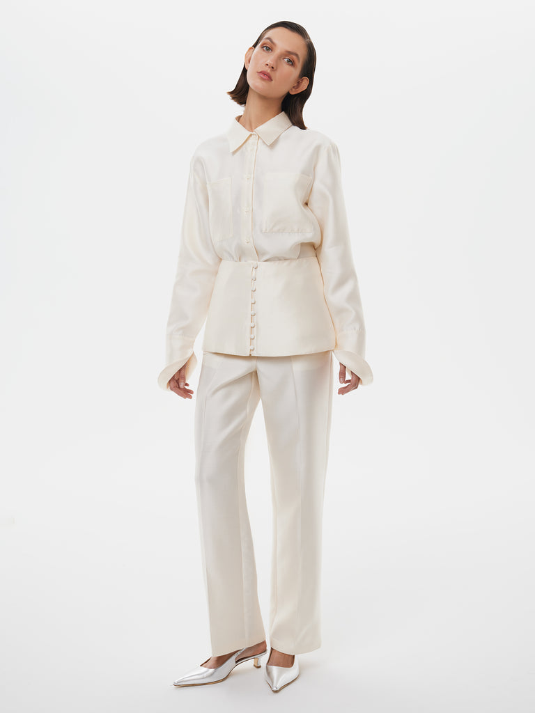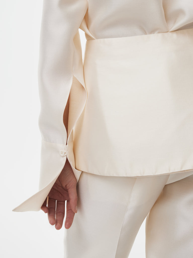 Crafted from a premium silk-wool blend, this belt skirt fastens with a row of fabric-covered buttons and is designed to layer over pants, dresses, or another skirt, creating an elevated, architectural silhouette. Comes in two colorways.