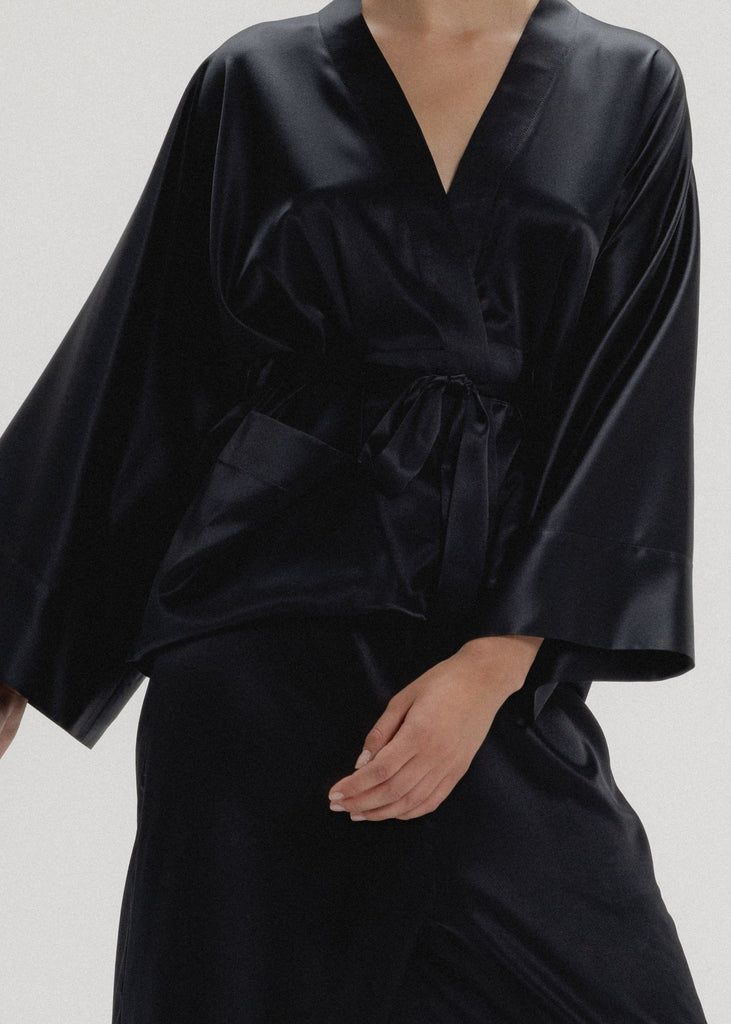 Silk jacket with oversized square pockets and matching belt in original kimono cut.