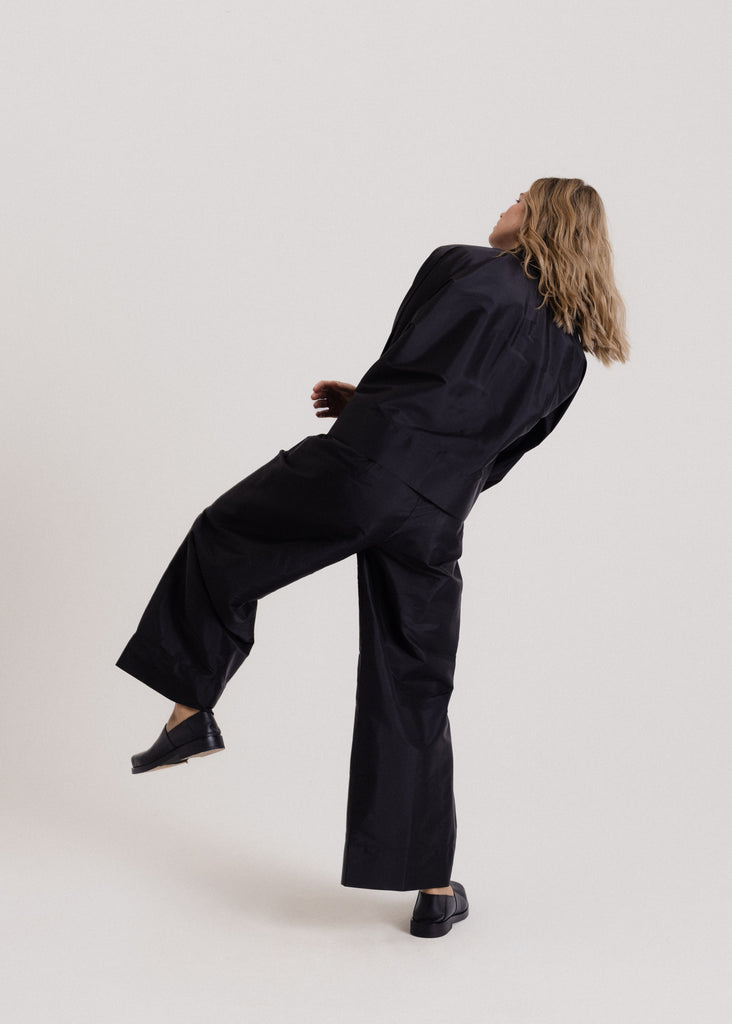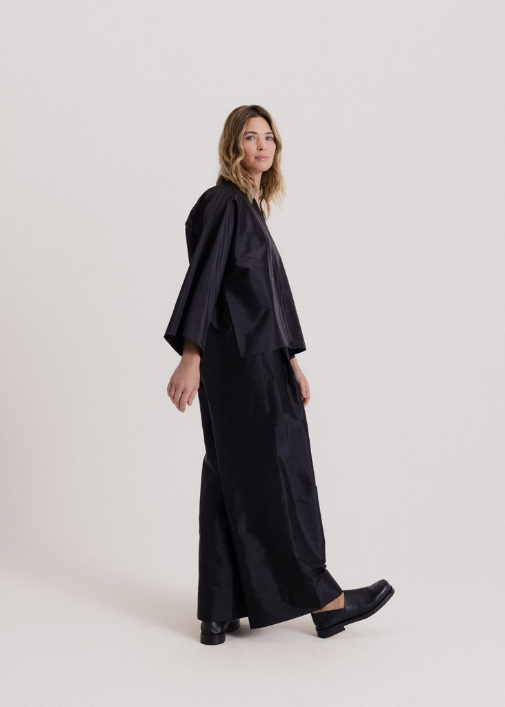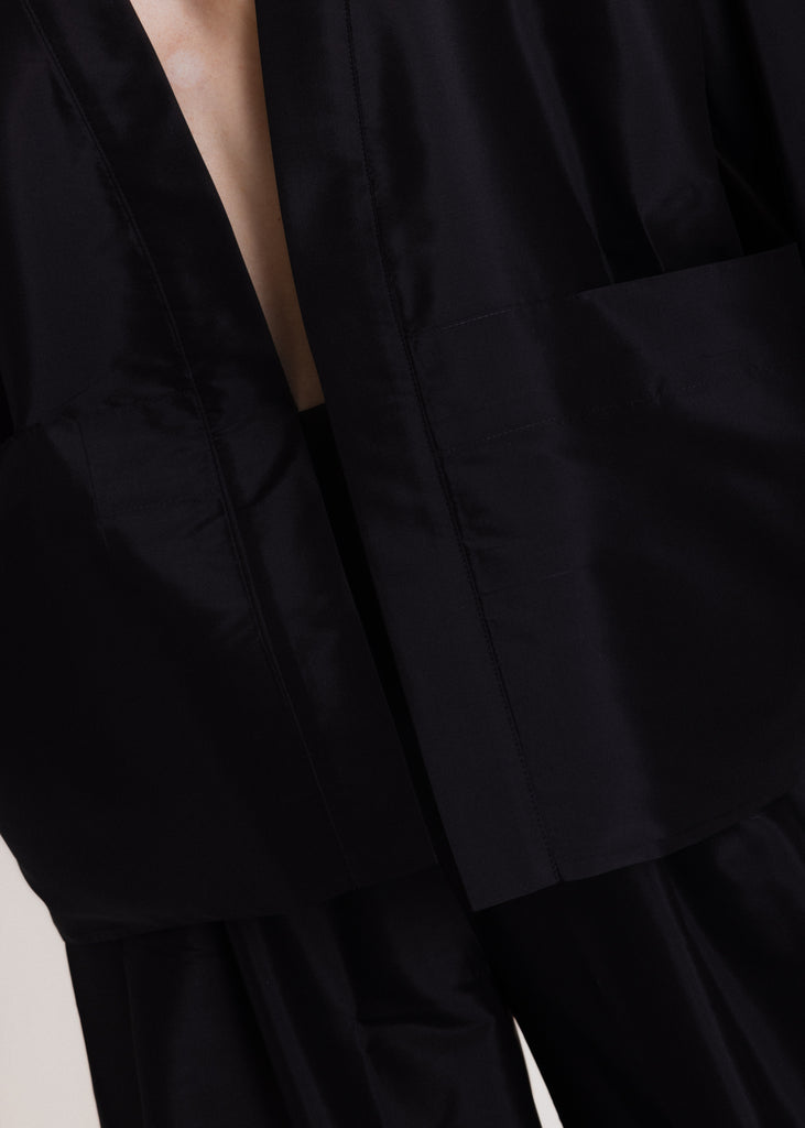 Taffeta jacket with oversized square pockets and matching belt in original kimono cut.
