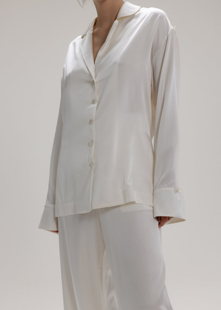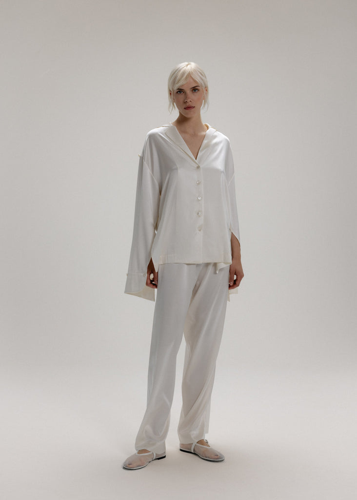 Silk shirt and pants set. Versatile silk shirt can be worn in several different ways by changing cuff style. Straight-cut loose silk pants with square inseam pockets.
